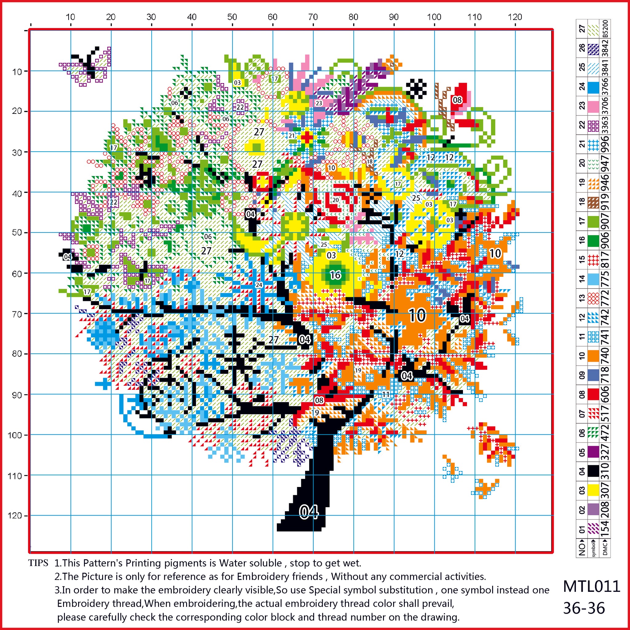 The color block in the picture does not represent the color of the embroidery thread. Please carefully identify the symbol or serial number corresponding to the color block, and select the number of lines according to the requirements of the serial number.
