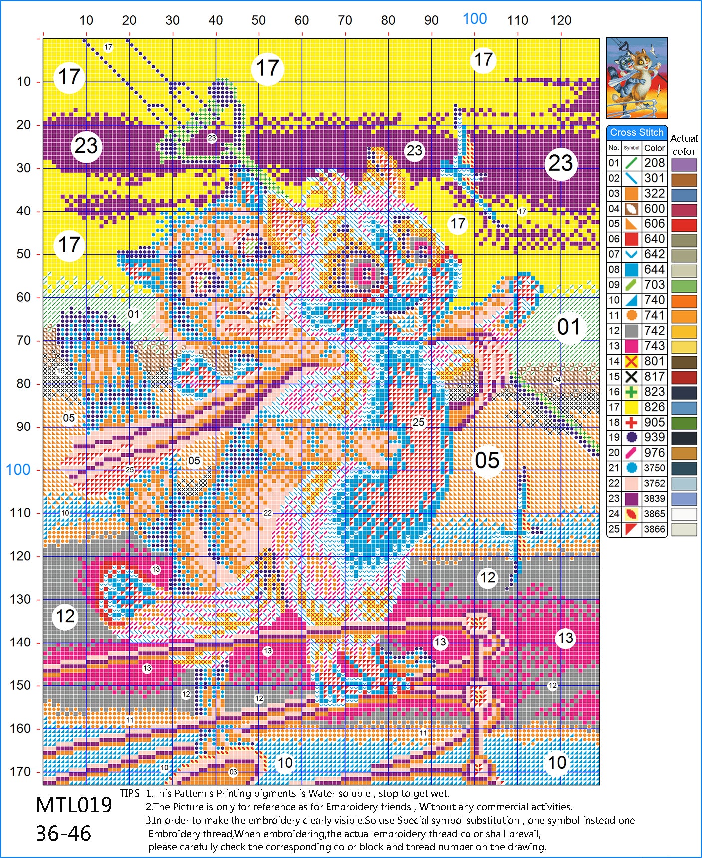 The color block in the picture does not represent the color of the embroidery thread. Please carefully identify the symbol or serial number corresponding to the color block, and select the number of lines according to the requirements of the serial number.