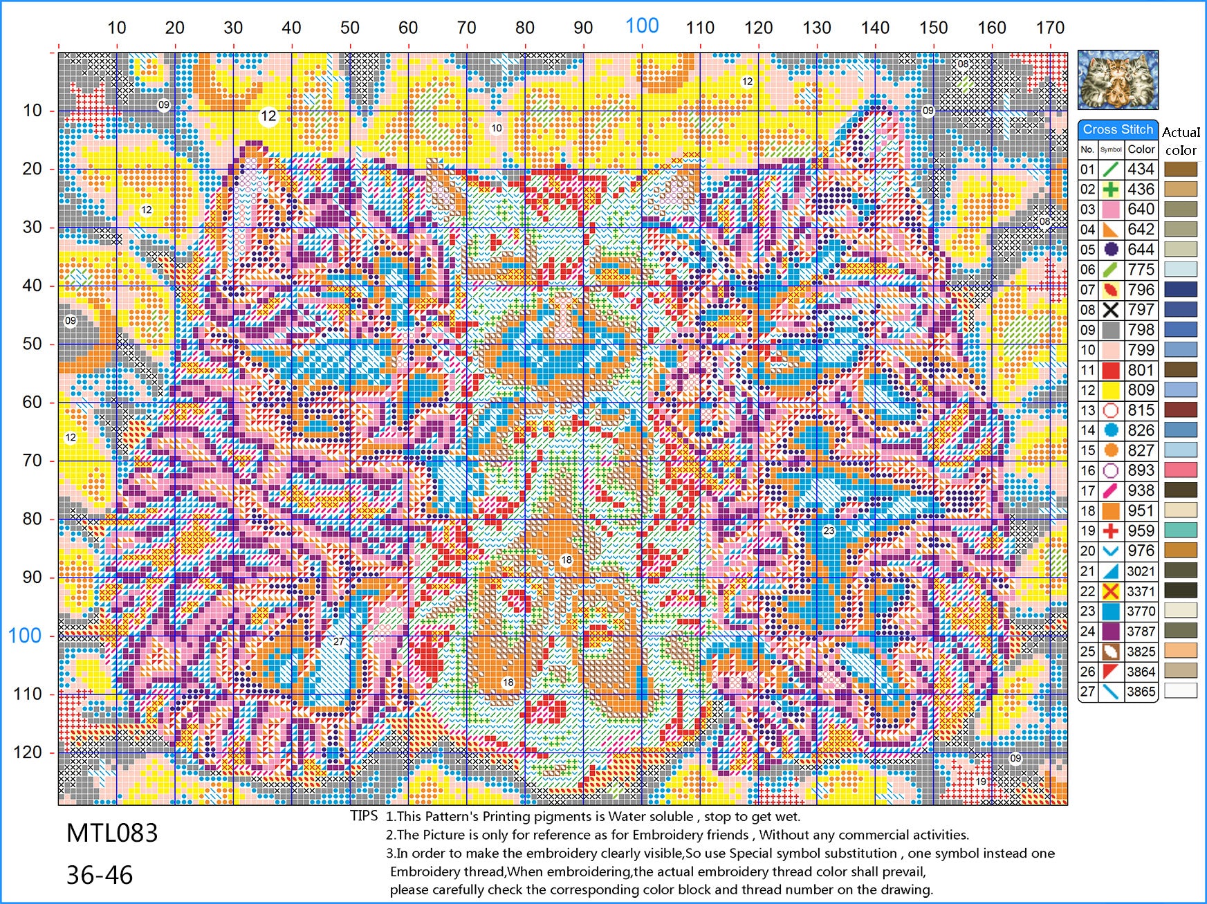 The color block in the picture does not represent the color of the embroidery thread. Please carefully identify the symbol or serial number corresponding to the color block, and select the number of lines according to the requirements of the serial number.
