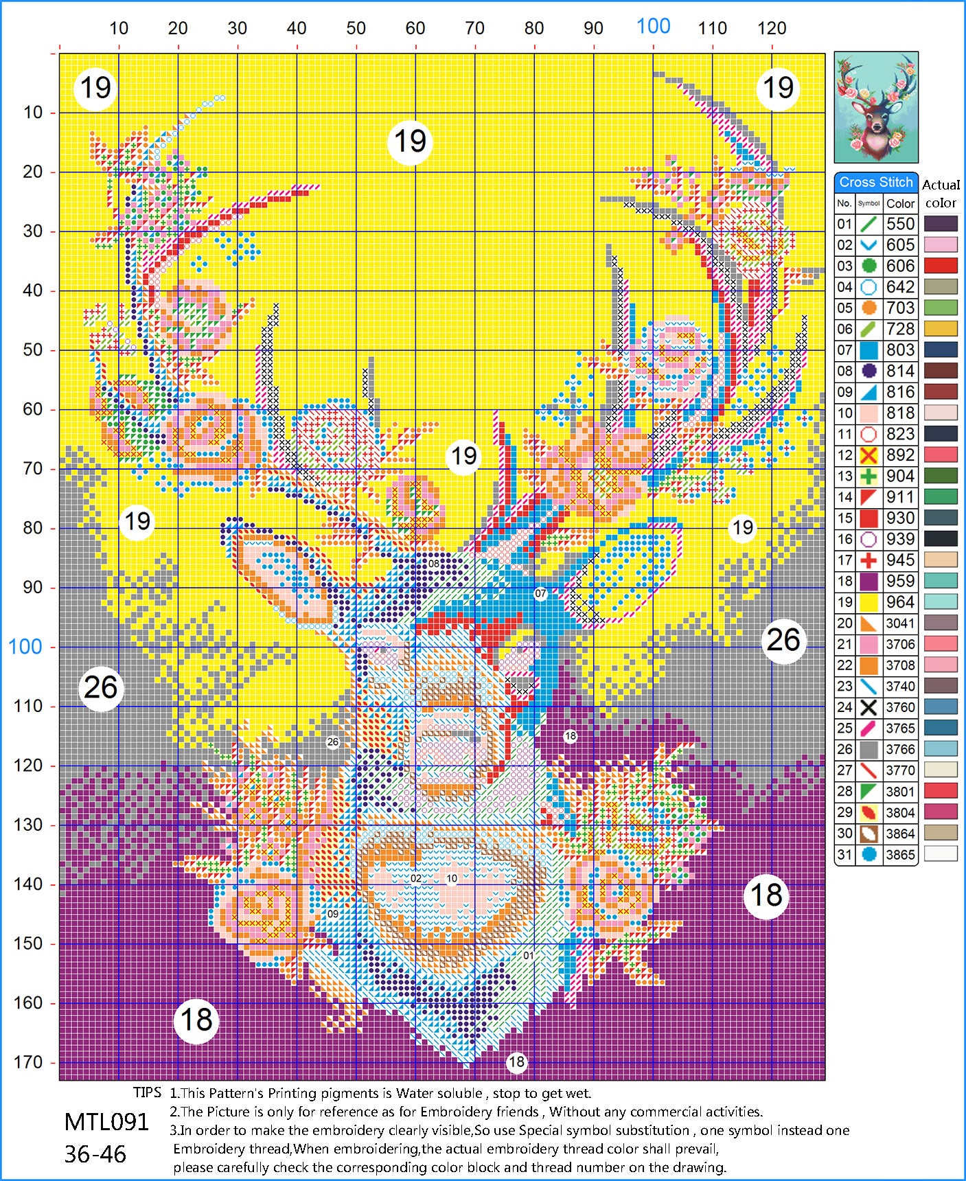 The color block in the picture does not represent the color of the embroidery thread. Please carefully identify the symbol or serial number corresponding to the color block, and select the number of lines according to the requirements of the serial number.