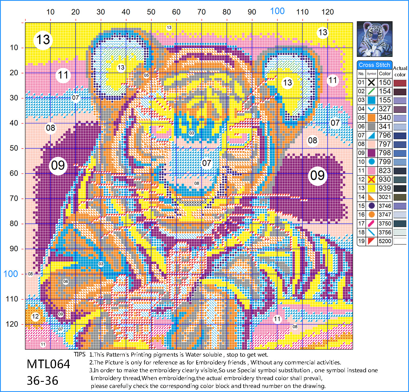 The color block in the picture does not represent the color of the embroidery thread. Please carefully identify the symbol or serial number corresponding to the color block, and select the number of lines according to the requirements of the serial number.